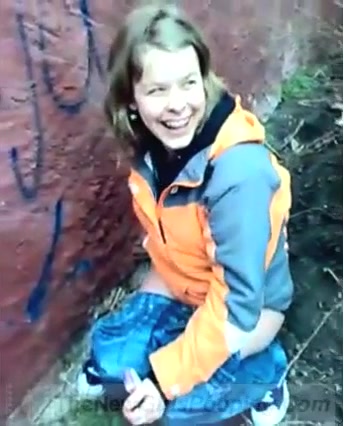 Middle aged women was walking around a park outside. She really needs to take a shit so she went behind a building so no one can see her. She drops a big pile of shit on the ground.