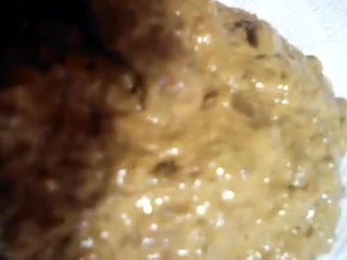 Teen hairy girl records her asshole in close up while she's pooping a yellow creamy shit on a white napkin on the floor.