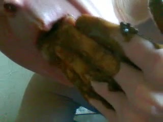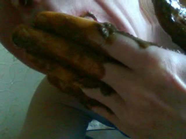 Mature man smears fresh shit on his arms and fingers. He starts eating all that shit…like a scat pig.
