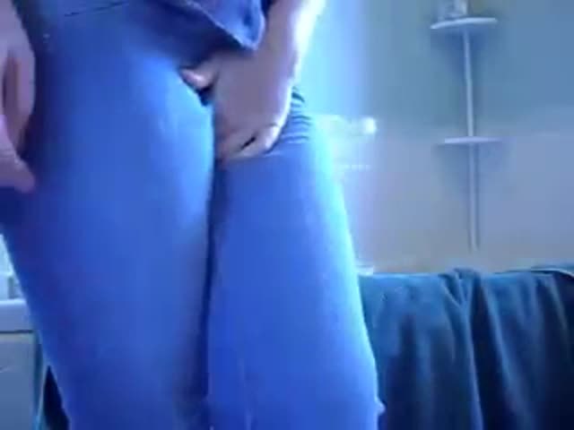 Sexy girl tried to stop the ruge to piss…in less than thirty seconds she failed as she piss in her blue jeans.