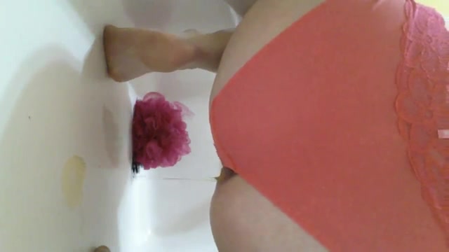 Skinny girl is trying to poop in her orange panties. She kinda failed because the poop fell on the floor.