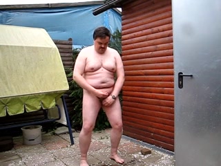 Mature man lets his girlfriend to record him while he's peeing on the ground…outdoor.