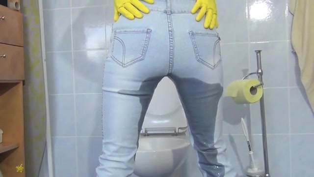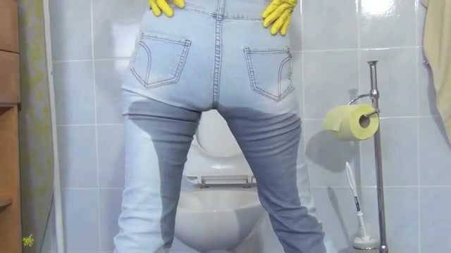 Brunette teen girl is peeing and pooping in her blue jeans while she was trying to clean the bathroom