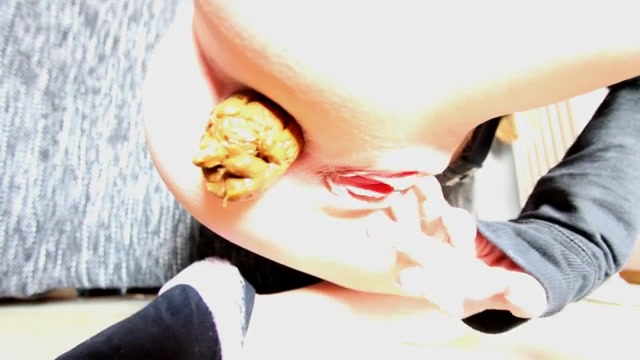 Smoking hot babe is moving her wet clitoris around while she's pooping a monster turd on the floor.
