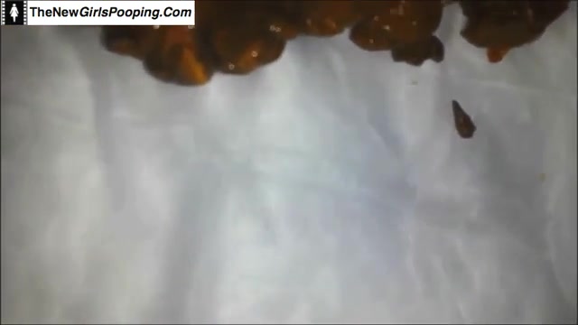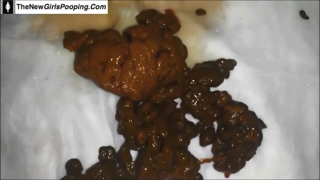 Brunette ebony babe is pooping on a white napkin. She sits on her knees with her ass pointing to the camera.