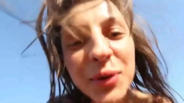 Hot brunette babe sits naked outdoor near a beach. She's peeing on the floor while teasing us.