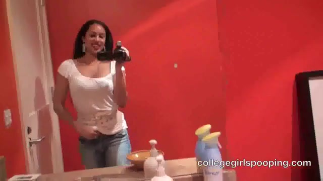Brunette girl is pooping in a yellow bowl. She left the scene without wiping her asshole.