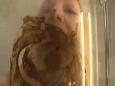 Blonde babe smearing poop on her entire body while she sits naked in the shower.