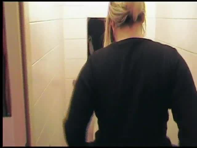 Blonde babe sitting in reverse position while she's pooping in the toilet.