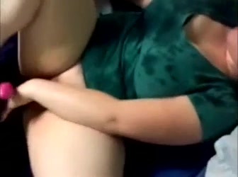 Chubby girl sits on her back on the bed while she's masturbating with a pink dildo. She starts squirting all over herself.