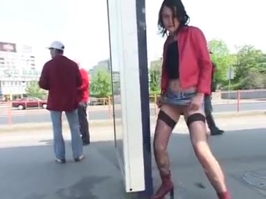 Brunette teen girl peeing at a bus stop in public. Two guys didn't know how to react.