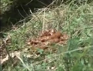 Skinny teen girl is pooping on the ground, in the middle of an open field.