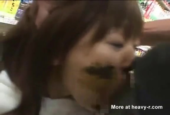 Brown haired Japanese girl sucking a big cock while a guy is smearing poop on her face. They are doing that in a supermarket.