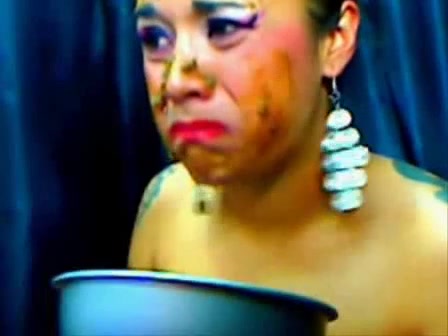 Brunette latina shitting on a green plate while working on a webcams website.