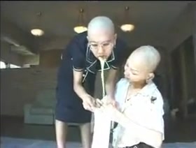 Two bald Asian girls are puking on each other outdoor. This is some bizzare shit right there.