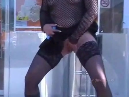 Having a piss infront of the store and touching her tits