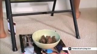 Brunette ebony babe is shitting a lot on a green plate while she sits half naked on a black chair.