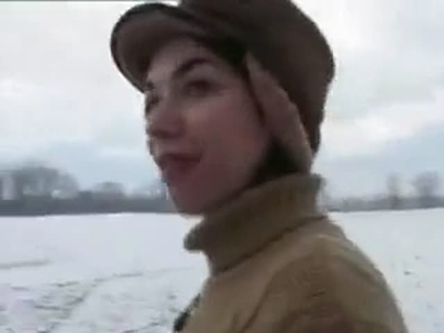 Brunette wild Siberian girl is shitting on the snow, on the ground. Her home toilet is out of service.