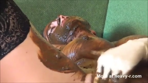 Brunette woman is smearing poop on her entire body. She inserts a long white dildo into her pussy, masturbating.