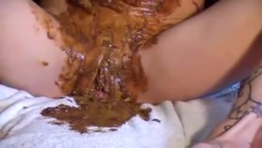 Brown haired teen girl is smearing shit on her naked body while she's talking with her boyfriend on live webcam.