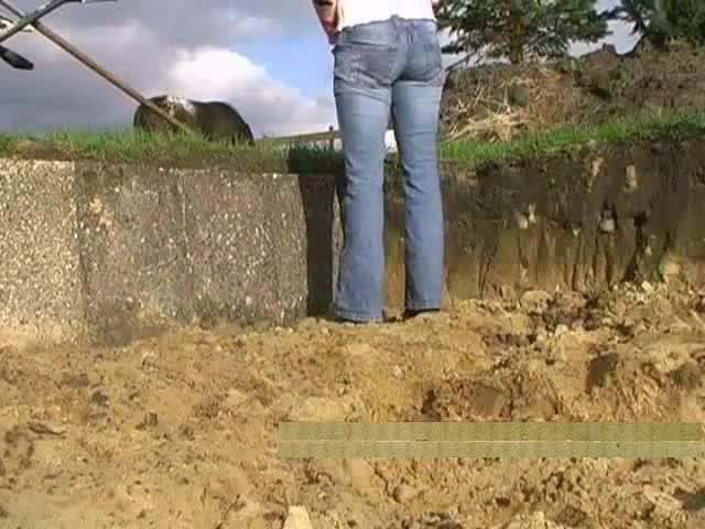 Blonde woman shitting at a farm