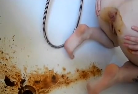 Brunette teen girl did enema while sitting naked in the bathtub. She starts pooping diarheea all over, making a real mess.
