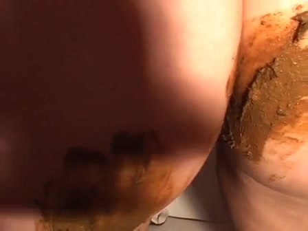 Teen girl is smearing fresh crap from the toilet on her entire body. She's using poop as body lotion.