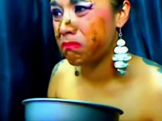 Brunette latina with two tattoos on her right arm was paid by her webcam viewers to eat saved shit from a plate.