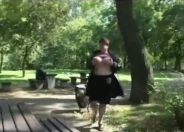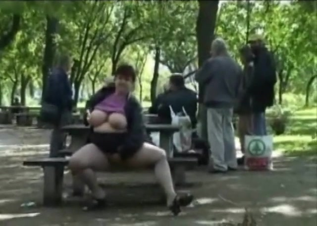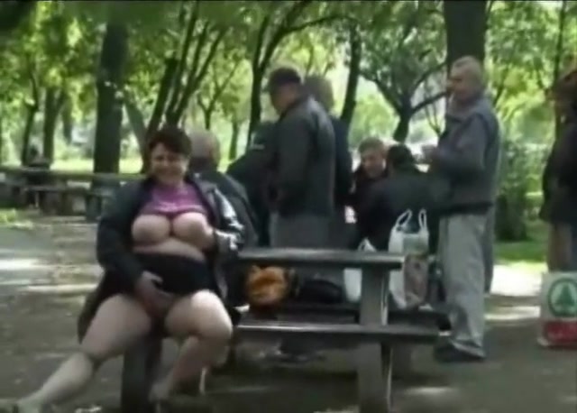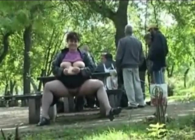 Fat girl playing with her tits and taking a piss in public while old guys are around her