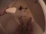 Blonde babe is pooping in the bathtub, she did a real mess as she smeared poop on her legs. She wants to clean all that poop with warm water.
