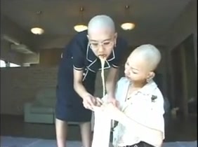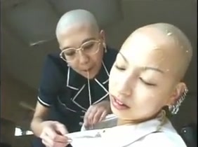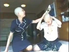 Two bald chicks are puking on each other. One of them sits half naked on the floor while the other is puking on her entire face.