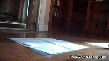 Beautiful teen sits naked on her knees in doggy style position while she's pooping in a plastic bowl.