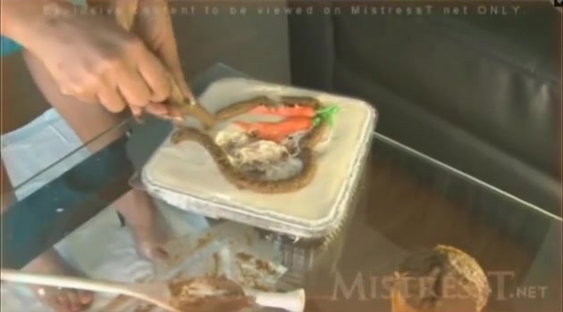 Hot brunette that's wearing a blue dress is shitting on top of a cake. She wants to surprise her boyfriend that's into scat.