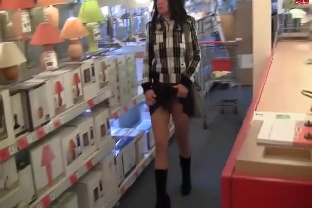 Hot brunette searching for some specific in a store. She can't stop the urge to pee so she starts peeing on the floor while walking.