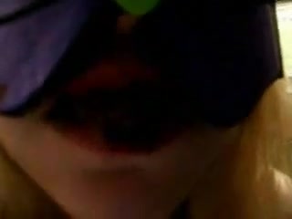 Blonde Kitty Kat is eating her fresh shit from a white plate. She's wearing a funny mask, to hide her face.