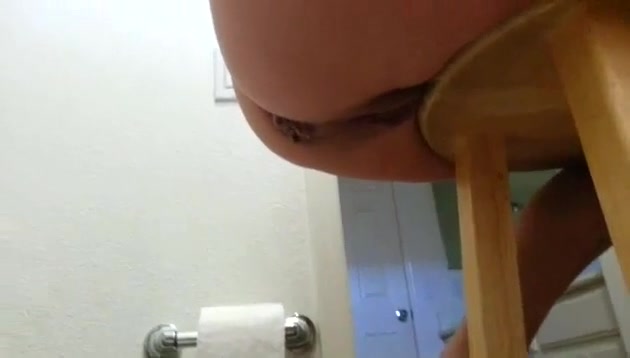 Hot girl sits naked on a wooden chair while she's pooping a big turd that fell on the floor.