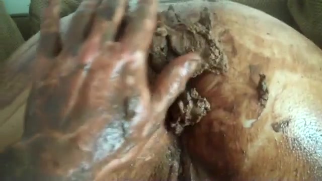 Lovely husband is rubbing fresh poop on the naked body of his wife after great sex.