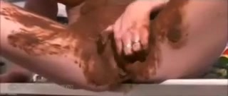 Beautiful brunette teen rubbing poop on her half naked body