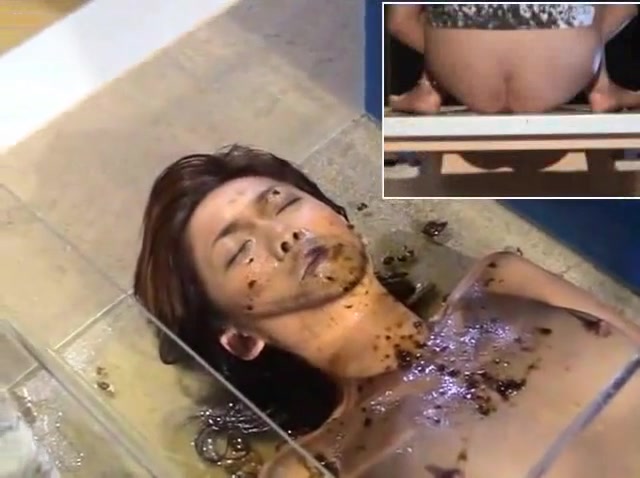Japanese girl sits naked on the floor, holding her head in a plastic device. Two random sexy girls are shitting on her entire face and body.