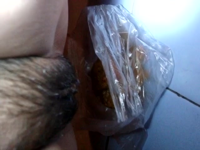 Hairy girl shitting on a plastic bag in close up