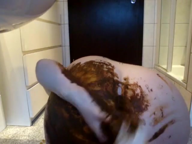 Chubby babe is smearing her own shit on her big ass and big tits. She starts masturbating with a long dildo.