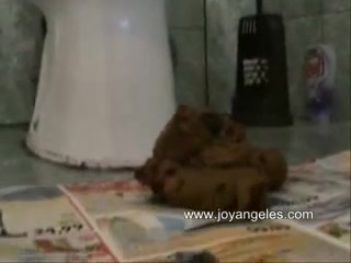 Smoking hot girl sits half naked on a toilet. She pulled up her green dress so she can poop a big pile of shit on the bathroom floor.