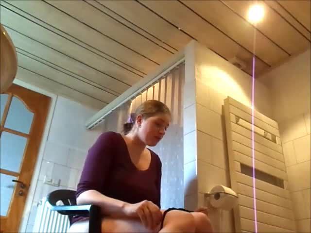 Blonde teen sits naked on a homemade toilet. She dropped a big pile of shit on her boyfriends cock, forcing him to masturbate with shit.