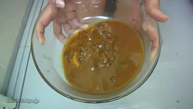Brunette hottie slowly pours liquid poop on her head. She wants to wash hear hair with fresh shit.