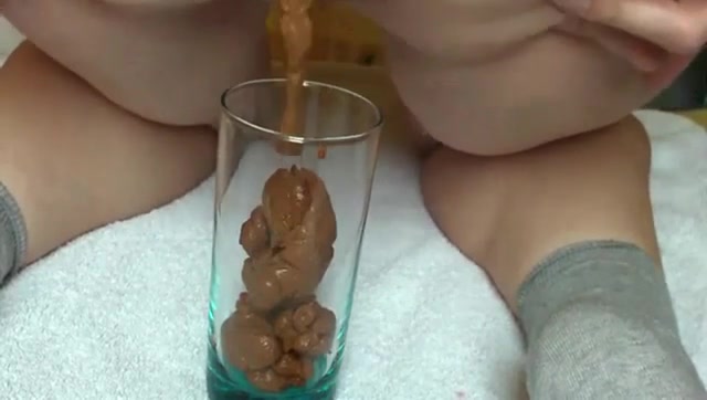 Horny girlfriend is pooping a big chunk of shit into a Pepsi Glass.