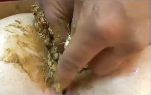 Perfect girl trying to stuff fresh shit in her own butthole while she sits naked on her knees, on the bedroom floor.