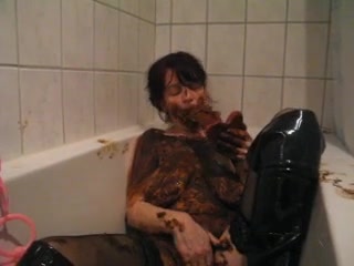 Brunette MILF sits in the bathtub as she's smearing black shit on her entire body.