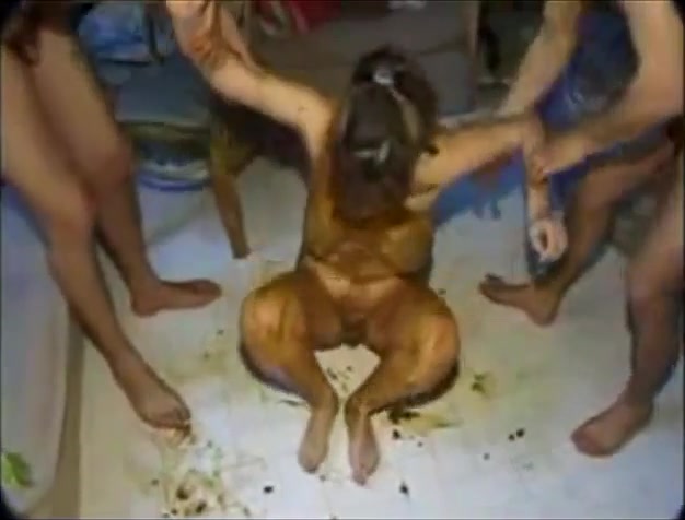 Amateur lady convinced by a bunch of guys to participate at a gangbang. She's smearing crap on her entire body before fucking with them.