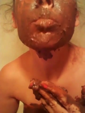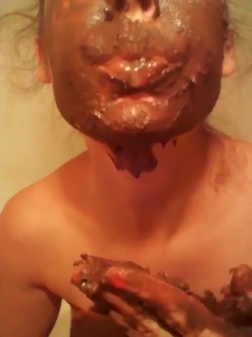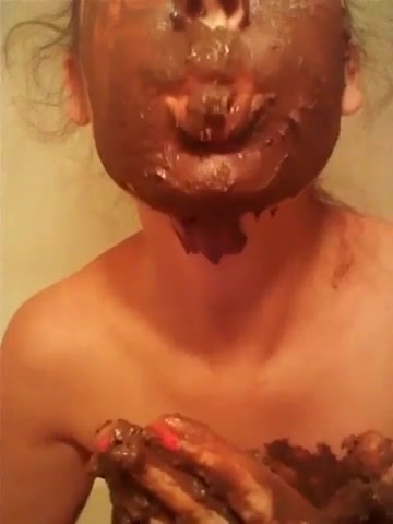 Young girl sits naked on the bathroom floor as she's smearing crap on her entire face. She's eating all that poop from her hands and face.