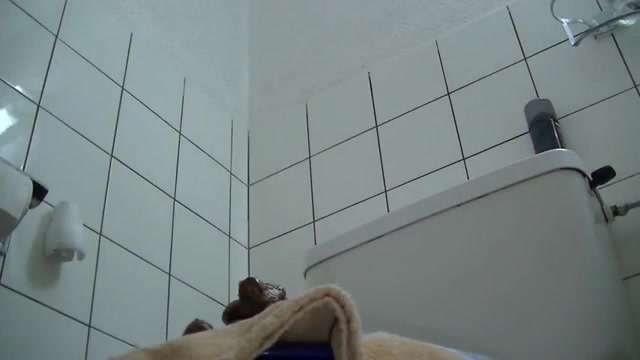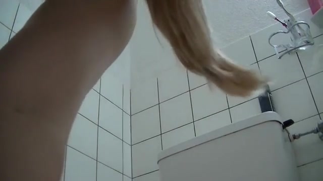 German blonde woman inserts a pink dildo into her tight pussy, masturbating. She dropped a heavy turd on a towel.